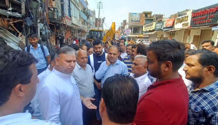 एनआईटी मार्किट में दुकानों में लगी आग से हुए नुकसान का जायजा लेने पहुंचे कांग्रेसी नेता