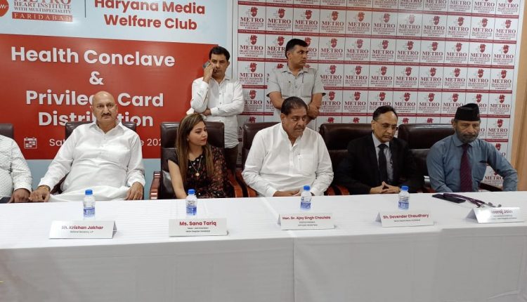 फरीदाबाद: पंकज अरोड़ा: मेट्रो हार्ट इंस्टिट्यूट एवं मल्टीस्पेशलिटी हॉस्पिटल द्वारा शनिवार को हरियाणा मीडिया वेलफेयर क्लब के सदस्यों को मेडिकल हेल्थ प्रिविलेज कार्ड वितरित किये गए I कार्यक्रम में मुख्य अतिथि के रूप में जननायक जनता पार्टी के राष्ट्रीय अध्यक्ष डॉ. अजय सिंह चौटाला ने शिरकत की I कार्यक्रम में विशिष्ट अतिथि के रूप में पार्टी के राष्ट्रीय सचिव कृष्ण जाखड़, जिला अध्यक्ष राजेश भाटिया, अखिल भारतीय राष्ट्रीय ब्राह्मण सभा के अध्यक्ष सुरेंदर शर्मा ( बबली ),आर टी एस ग्रुप के चेयरमैन राजेश भारद्वाज उपस्थित रहे I कार्यक्रम का शुभारंभ दीप प्रज्वलन के साथ किया गया I मेट्रो अस्पताल प्रबंधन के मेडिकल डायरेक्टर डॉ. नीरज जैन, सीईओ मेजर जनरल वी के दत्ता एवं एडमिनिस्ट्रेशन हेड सना तारिक़ ने मुख्य अतिथि डॉ. अजय सिंह चौटाला का बुके देकर एवं शाल पहनाकर स्वागत किया I कार्यक्रम में उपस्थित पत्रकारों को दिए जाने वाले मेडिकल हेल्थ प्रिविलेज कार्ड की लॉन्चिंग डॉ. अजय सिंह चौटाला ने करते हुए कहा कि पत्रकार समाज को आइना दिखाने का काम करते है समाज की हर छोटी बड़ी घटनाओं की जानकारी इनके माध्यम से ही हम तक पहुँच पाती है। आज मेट्रो हॉस्पिटल ने पत्रकारों के हितों को ध्यान में रखते हुए मेडिकल हेल्थ प्रिविलेज कार्ड की जो सुविधा दी है वह बेहतरीन कदम है। समाज की अन्य संस्थाओं को भी इस तरह का सहयोग पत्रकारों के हित में करना चाहिए । उन्होंने पत्रकारों के हितों और कल्याण के लिए सौपीं गयी मांगों को जल्द से जल्द सरकार के द्वारा पूरा कराने का आश्वासन दिया। कार्यक्रम में क्लब के अध्यक्ष राकेश देव ने पत्रकारों के जीवन और उनके कार्यक्षेत्र में आने वाली कठिनाइयों का उल्लेख करते हुए कहा की पत्रकार बहुत ही कम वेतन पर अपनी जान जोखिम में डालकर समाज के सामने सच्चाई पेश करने का काम करते है ।