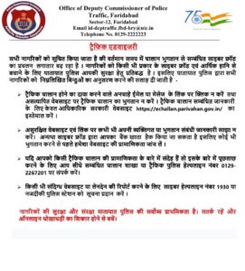 खबरेंNcr रिपोर्टर पंकज अरोड़ा फरीदाबाद: 11 जुलाई, आजकल ऑनलाइन चालान का लिंक भेजकर आमजन के साथ होने वाली साइबर ठगी से बचने के लिए डीसीपी ट्रैफिक उषा के निर्देशानुसार यातायात पुलिस द्वारा साइबर एडवाइजरी जारी की गई है।
