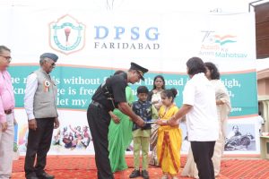 डीपीएसजी, फरीदाबाद: 15 अगस्त, देश की आजादी के 75 वर्ष पूरे होने के उपलक्ष्य में “आजादी का अमृत महोत्सव” मना रहा है। दस दिनों तक चलने वाले कार्यक्रमों की श्रृंखला में 15 अगस्त 2022 को स्वतंत्रता दिवस बड़ी धूम-धाम से मनाया गया| सर्वप्रथम छात्र परिषद ने मार्च पास्ट करते हुए माननीय मुख्य अतिथि लेफ्टिनेंट कर्नल सुरेश चंद तंवर के साथ गेस्ट ऑफ़ ऑनर विंग कमांडर एच.सी.मान का स्वागत किया| इसके पश्चात मुख्य अतिथि लेफ्टिनेंट कर्नल सुरेश चंद तंवर के साथ विंग कमांडर एच.सी. मान, रविन्द्र दहिया, कंचन कुकरेजा, मधुमिता कौशिक, विद्यालय की प्राचार्या प्रीति सांगवान, अभिभावकों, पूर्व छात्रों, शिक्षकों व विद्यार्थियों ने हमारे राष्ट्रीय गौरव के प्रतीक राष्ट्र ध्वज फहराया| ध्वज को सलामी देते हुए सभी ने राष्ट्रगान गाया।