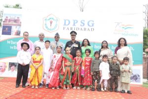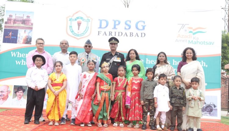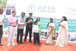 डीपीएसजी, फरीदाबाद: 15 अगस्त, देश की आजादी के 75 वर्ष पूरे होने के उपलक्ष्य में “आजादी का अमृत महोत्सव” मना रहा है। दस दिनों तक चलने वाले कार्यक्रमों की श्रृंखला में 15 अगस्त 2022 को स्वतंत्रता दिवस बड़ी धूम-धाम से मनाया गया| सर्वप्रथम छात्र परिषद ने मार्च पास्ट करते हुए माननीय मुख्य अतिथि लेफ्टिनेंट कर्नल सुरेश चंद तंवर के साथ गेस्ट ऑफ़ ऑनर विंग कमांडर एच.सी.मान का स्वागत किया| इसके पश्चात मुख्य अतिथि लेफ्टिनेंट कर्नल सुरेश चंद तंवर के साथ विंग कमांडर एच.सी. मान, रविन्द्र दहिया, कंचन कुकरेजा, मधुमिता कौशिक, विद्यालय की प्राचार्या प्रीति सांगवान, अभिभावकों, पूर्व छात्रों, शिक्षकों व विद्यार्थियों ने हमारे राष्ट्रीय गौरव के प्रतीक राष्ट्र ध्वज फहराया| ध्वज को सलामी देते हुए सभी ने राष्ट्रगान गाया।