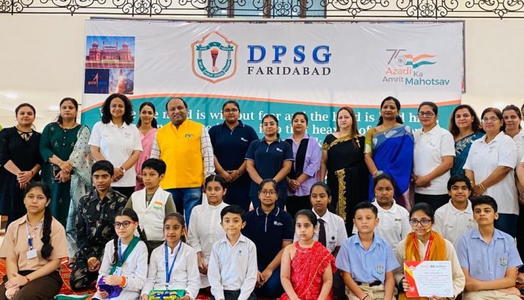 फरीदाबाद: 17 अगस्त, डी.पी.एस.जी. फरीदाबाद देश की आजादी के 75 वर्ष पूरे होने के उपलक्ष्य में “आजादी का अमृत महोत्सव” मना रहा है। दस दिनों तक चलने वाले कार्यक्रमों की श्रृंखला में 16 अगस्त 2022 को विद्यालय के प्रांगण में अंतरविद्यालय प्रतियोगिताओं में देशभक्ति पर आधारित हिंदी ,अंग्रेजी कविता गायन , वाद-विवाद प्रतियोगिता और फुटबॉल टूर्नामेंट ( अंडर 16 ) का आयोजन किया गया | इन सभी प्रतियोगिताओं में शहर के अनेक विद्यालयों ने बढ़- चढ़ कर हिस्सा लिया |हिंदी व अंग्रेजी कविताओं के माध्यम से छात्रों ने देश भक्ति की भावना को दर्शाया तथा देश के वीरों व शहीदों को याद करते हुए उनके प्रति अपने भावों को व्यक्त किया|आज की इन प्रतियोगिताओं में निर्णायक के रूप में, अर्चना कॉल, शायनी अबे, संदीप मालिक (पूर्व राष्ट्रीय खिलाड़ी) और राजीव रंजन (उप महाप्रबंधक एन एच पी सी) जैसी जानी मानी हस्तियाँ शामिल रहीं| विद्यालय की प्राचार्या महोदया प्रीति सांगवान ने सभी का हार्दिक अभिनन्दन किया |