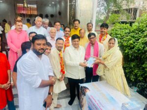 खबरेंNcr रिपोर्टर पंकज अरोड़ा फरीदाबाद: 21 सितंबर, पूर्व उद्योग मंत्री विपुल गोयल फ़रीदाबाद के नैहरपार सेक्टर 89 में स्थित टीडीआई रीट्रीट में नवनिर्मित हरि मंदिर के अंदर मूर्ति स्थापना व प्राण प्रतिष्ठा के अवसर पर पहुँचे। जहाँ संस्था के लोगों ने पूर्व उद्योग मंत्री विपुल गोयल का फूल मालाओ, पटका और मोमेंटो देकर सम्मानित किया।