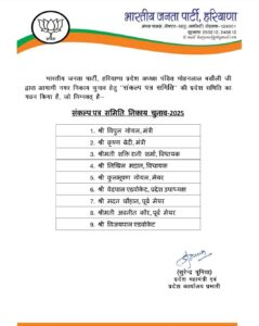 पंकज अरोड़ा की रिपोर्ट फरीदाबाद: हरियाणा में आगामी निकाय चुनाव को लेकर भारतीय जनता पार्टी (भाजपा) ने अपनी तैयारियों को तेज कर दिया है। पार्टी “ट्रिपल इंजन सरकार” के नारे के साथ सभी नगर निकायों में जोर-शोर से प्रचार कर रही है। इसी क्रम में, प्रदेश भाजपा ने निकाय चुनावों के लिए संकल्प पत्र समिति की घोषणा की है, जिसमें कैबिनेट मंत्री विपुल गोयल को जिम्मेदारी दी गई है।