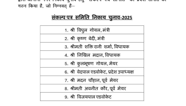 संकल्प पत्र समिति में विपुल गोयल के अलावा कैबिनेट मंत्री कृष्ण बेदी, भाजपा विधायक शक्ति रानी शर्मा एवं निखिल मदान, अन्य वरिष्ठ नेता एवं पूर्व मेयर शामिल हैं। यह समिति प्रदेशभर के नगर निकायों से जुड़े विषयों को ध्यान में रखते हुए आगामी पांच वर्षों के विकास कार्यों का एक ब्लूप्रिंट तैयार करेगी।