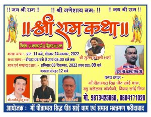 व्यास पीठ नै पं सुरेन्द्र बबली का माला पहनाकर सम्मान किया सुरेन्द्र बबली ने कहा श्रीराम कथा चरित्रवान बनाती है कथा श्रवण करने से जीवन सुधरता है इसलिए सभी से प्रार्थना कथा श्रवण अवश्य करें इस अवसर पर सम्मानित महानुभाव महिला शक्ति भक्तजन उपस्थित रहे