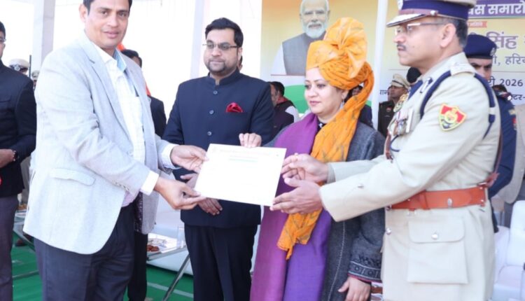 पंकज अरोड़ा की रिपोर्ट/फरीदाबाद: जिला प्रशासन फरीदाबाद द्वारा आयोजित गणतंत्र दिवस समारोह के अवसर पर समाजसेवी विमल खंडेलवाल को उनके उल्लेखनीय सामाजिक योगदान के लिए सम्मानित किया गया। यह सम्मान उन्हें मुख्य अतिथि हरियाणा सरकार की स्वास्थ्य मंत्री आरती राव द्वारा प्रदान किया गया। कार्यक्रम में उपायुक्त आयुष सिंह IAS, अतिरिक्त उपायुक्त सतबीर मान IAS, पुलिस कमिश्नर सत्येंद्र गुप्ता IPS, जॉइंट कमिश्नर सत्येंद्र दुग्गल IPS, एसडीएम अमित कुमार, जिला सिटी मजिस्ट्रेट अंकित कुमार तथा भाजपा जिला अध्यक्ष पंकज पूजन रामपाल विशेष रूप से उपस्थित रहे। इसके अतिरिक्त जिला प्रशासन के अन्य वरिष्ठ अधिकारी, विभिन्न विभागों के प्रतिनिधि एवं राजनीतिक व सामाजिक क्षेत्र से जुड़े गणमान्य लोग भी समारोह में मौजूद रहे।